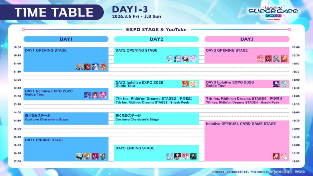 | 2026年3月6日(金) | 開場 9:00 閉場 18:00 (最終入場17:00) ※ 3日間とも上記時間 | hololive STAGE1 開場 17:00 / 開演 18:30 |