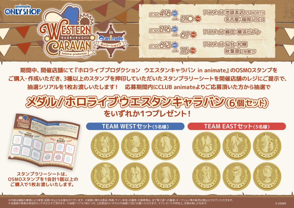 抽選で各5名様(計10名様)に【メダル/ホロライブウェスタンキャラバンTEAM EAST 6個セット】もしくは【メダル/ホロライブウェスタンキャラバンTEAM WEST 6個セット】をプレゼント。
